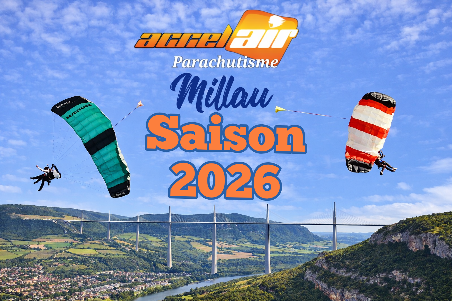 Nous avons le plaisir de vous annoncer la reprise de notre activité de sauts en parachute sur Millau en Aveyron pour la saison 2026, lieux du Viaduc à partir du week-end du 27-28 juin 2026.